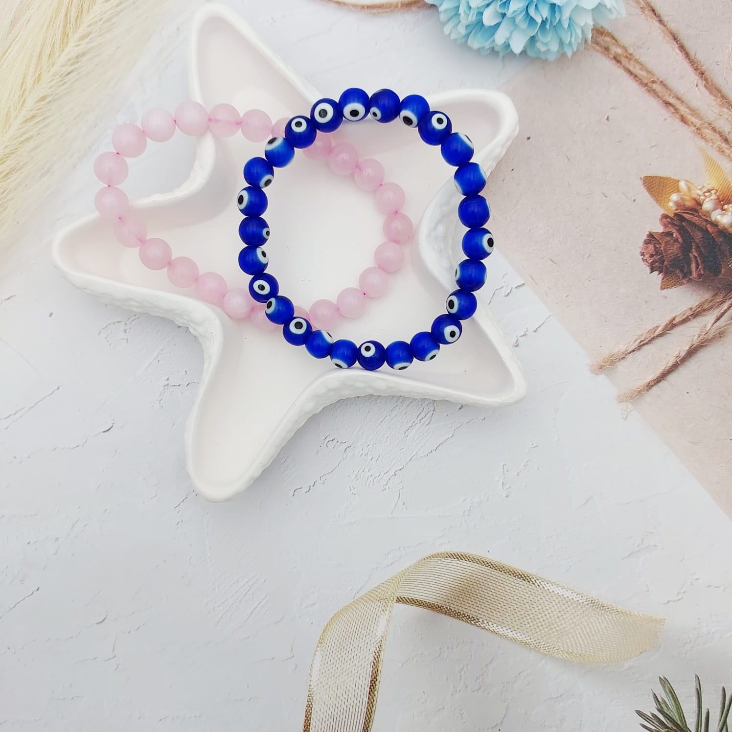 Embrace love, peace, and divine protection with our Rose Quartz & Evil Eye Bracelet Combo.