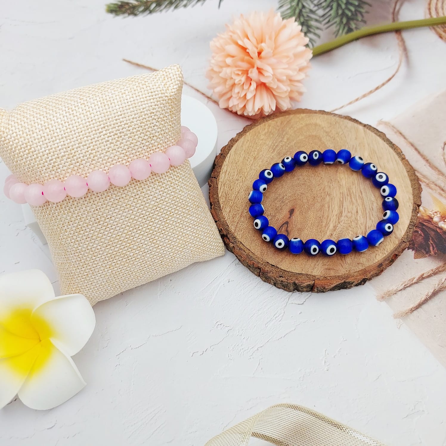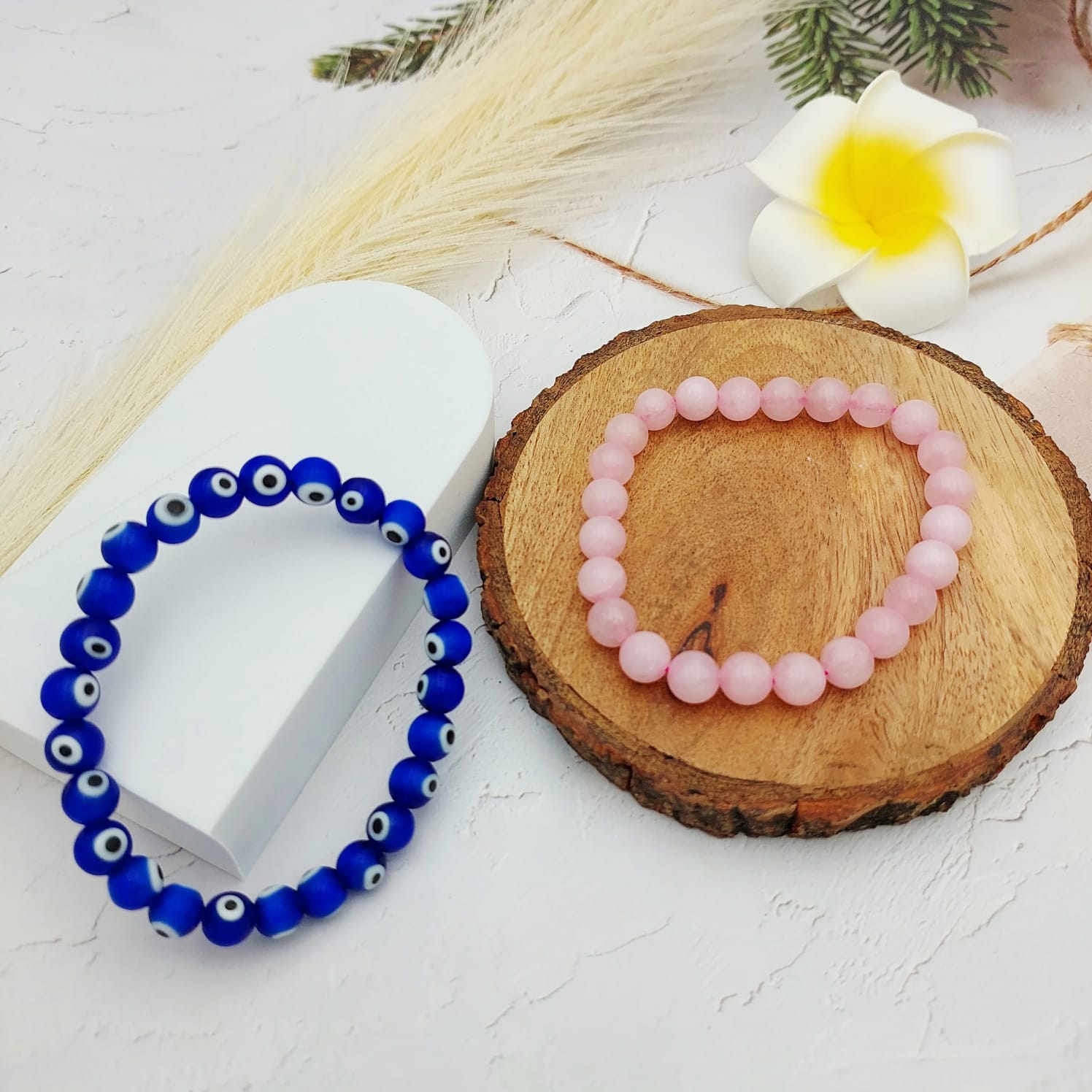 This beautifully balanced duo combines the gentle, heart-healing energy of Rose Quartz — the stone of unconditional love — with the powerful protective vibrations of the Evil Eye Bracelet, known to ward off negativity and harmful intentions.