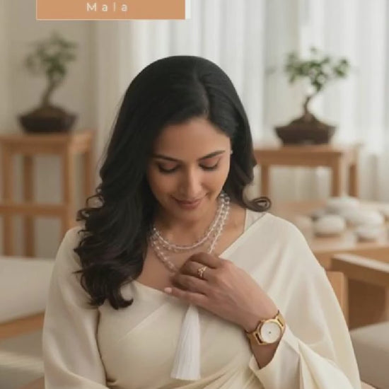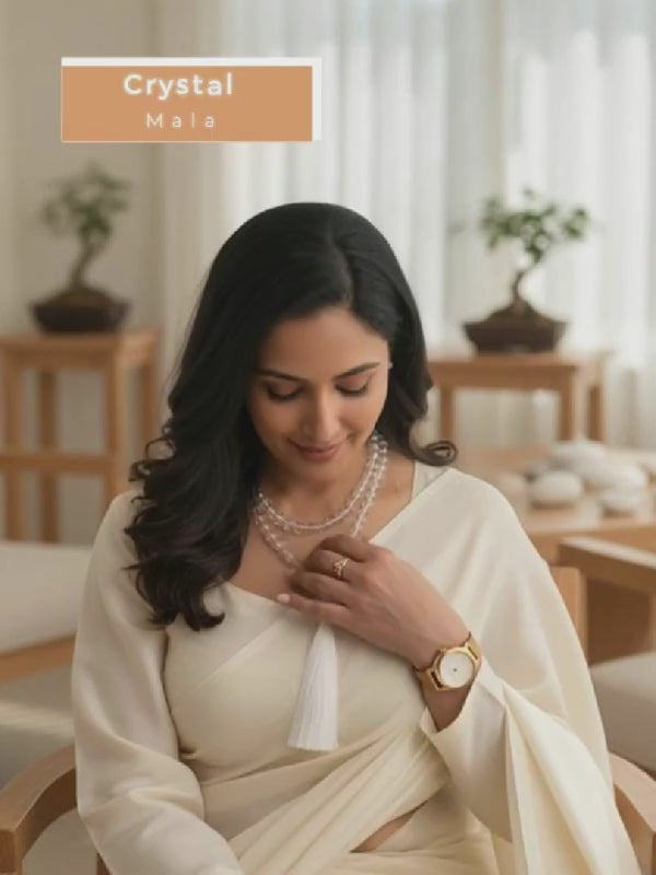 The Crystal Quartz Mala, also known as Sphatik Mala, is a divine symbol of purity, clarity, and spiritual energy. Made from natural clear quartz crystals, it is believed to store and amplify positive vibrations, purify the aura, and bring mental peace.