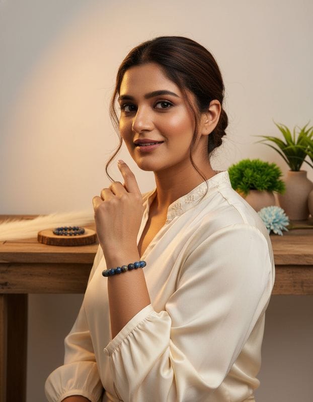 This bracelet helps stimulate the mind, open the Third Eye Chakra, and promote clarity in communication and decision-making.