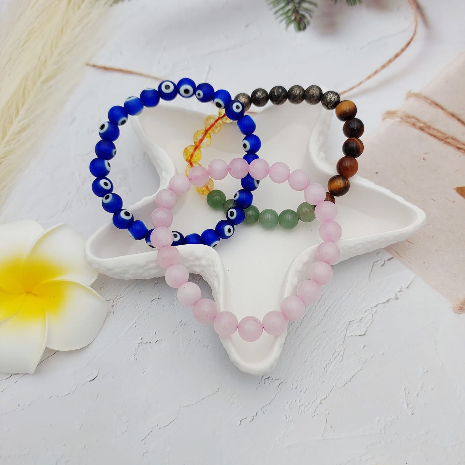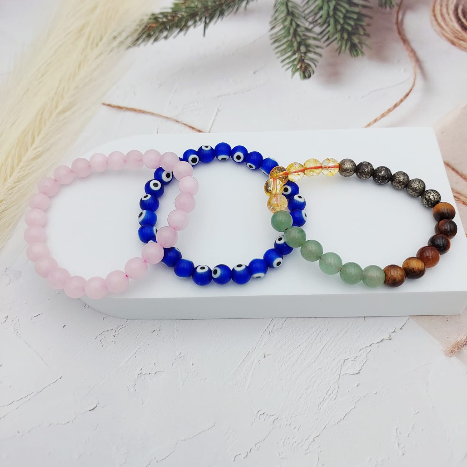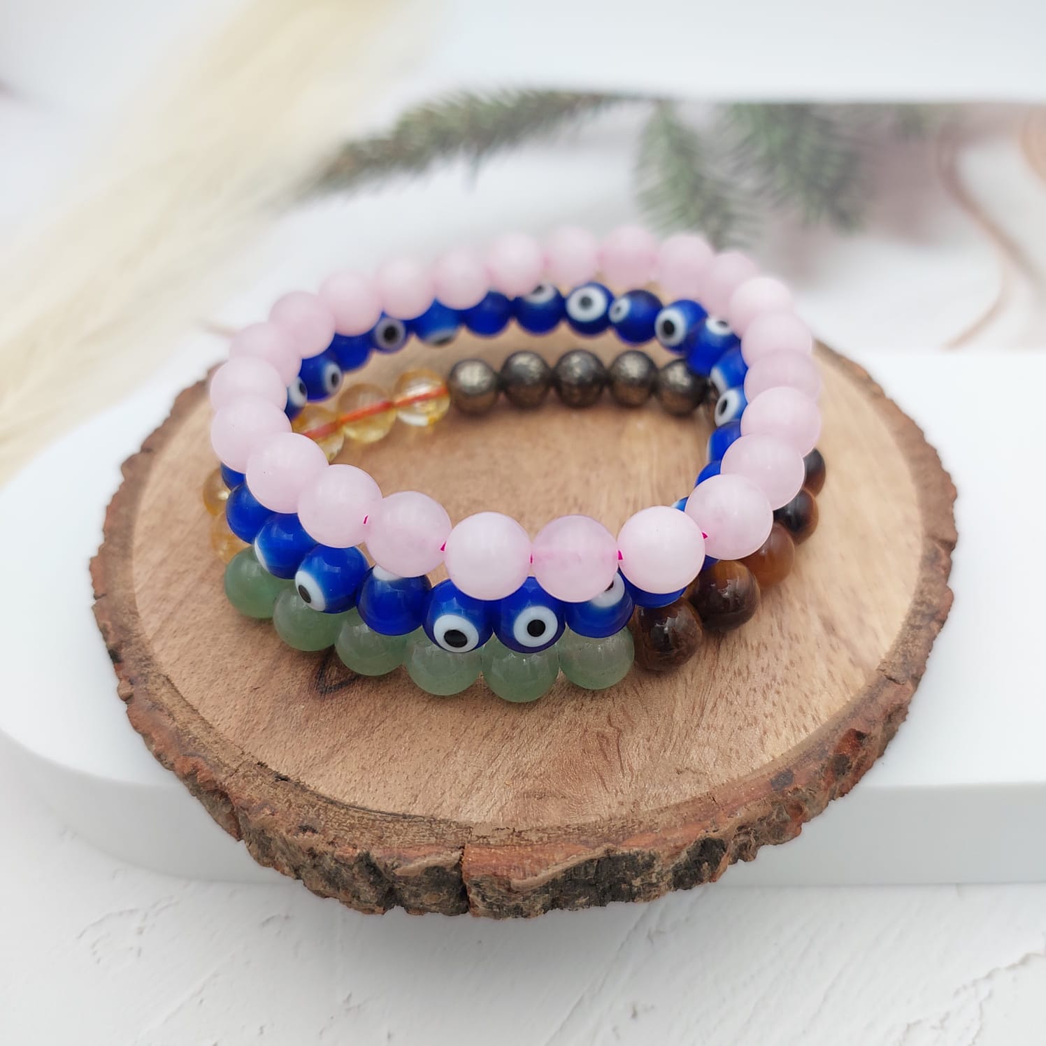This thoughtfully curated trio combines the gentle, heart-healing energy of Rose Quartz, the prosperity-attracting vibration of the Money Magnet Bracelet, and the powerful protective aura of the Evil Eye Bracelet.